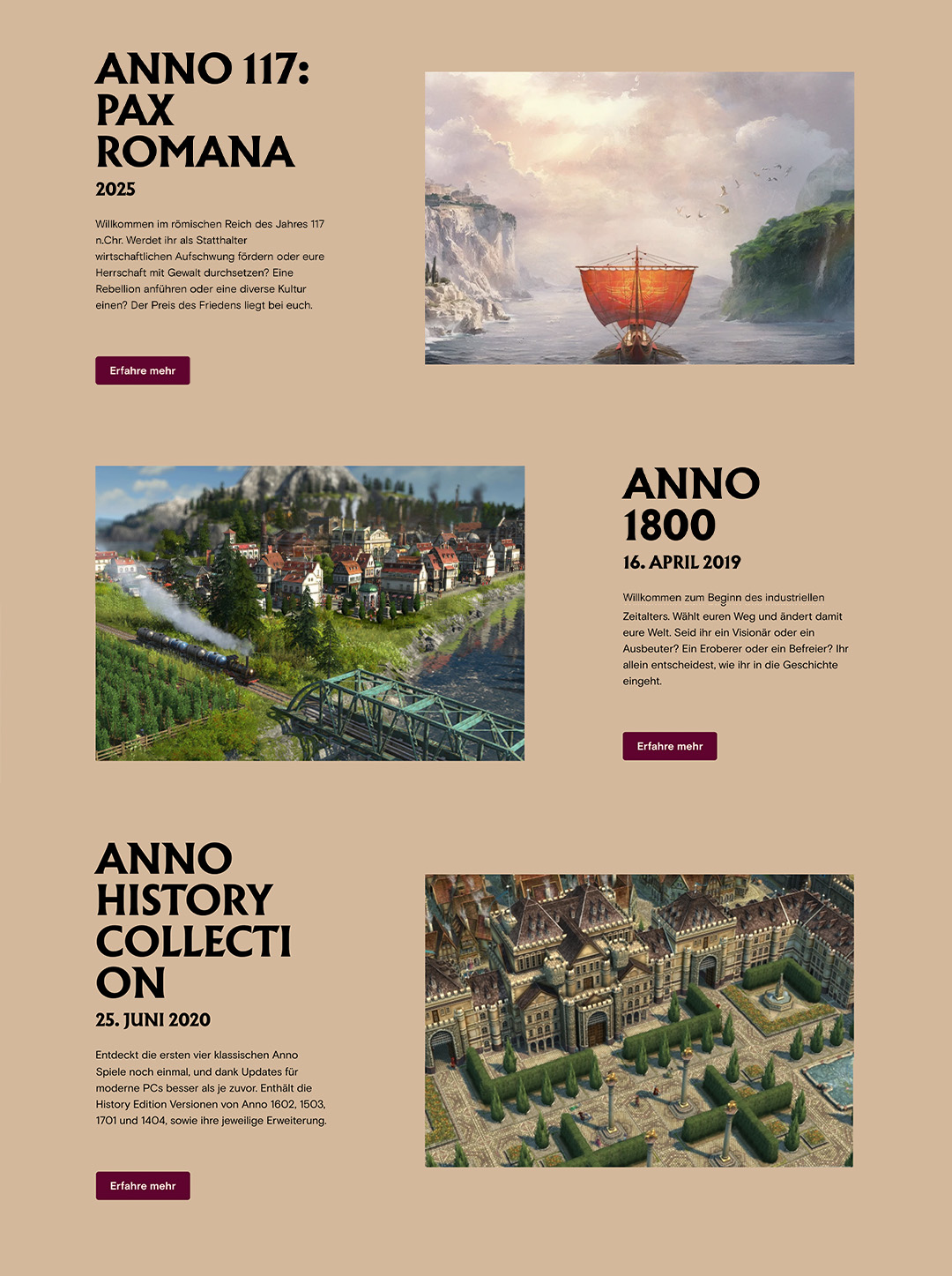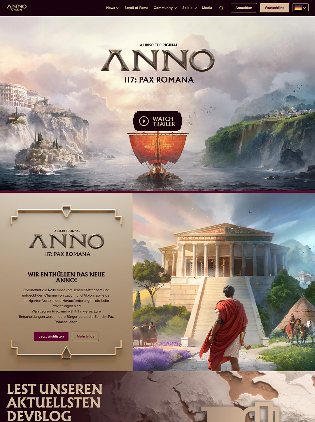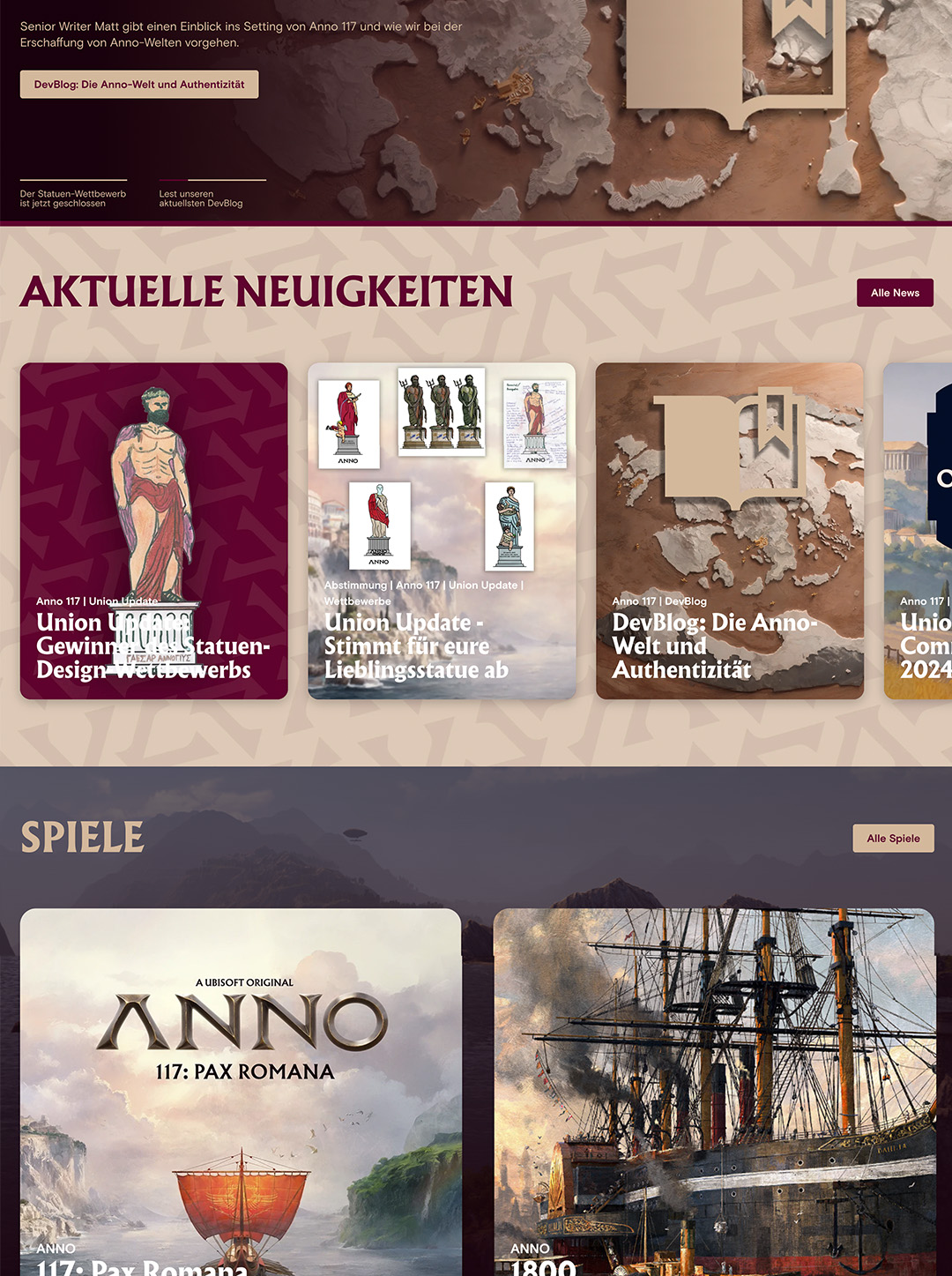 Ubisoft Blue Byte wanted to rejuvenate the Anno Union website to better reflect their updated corporate identity (CI) and create a more user-friendly, aesthetically pleasing platform. The task was to implement new branding elements, optimize the site’s components, and ensure a seamless integration of the updated visual style.