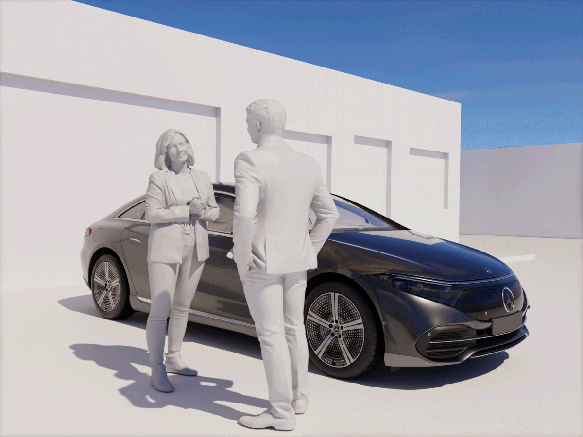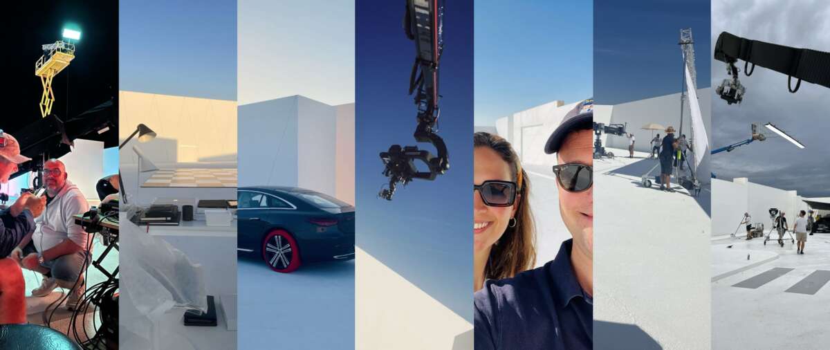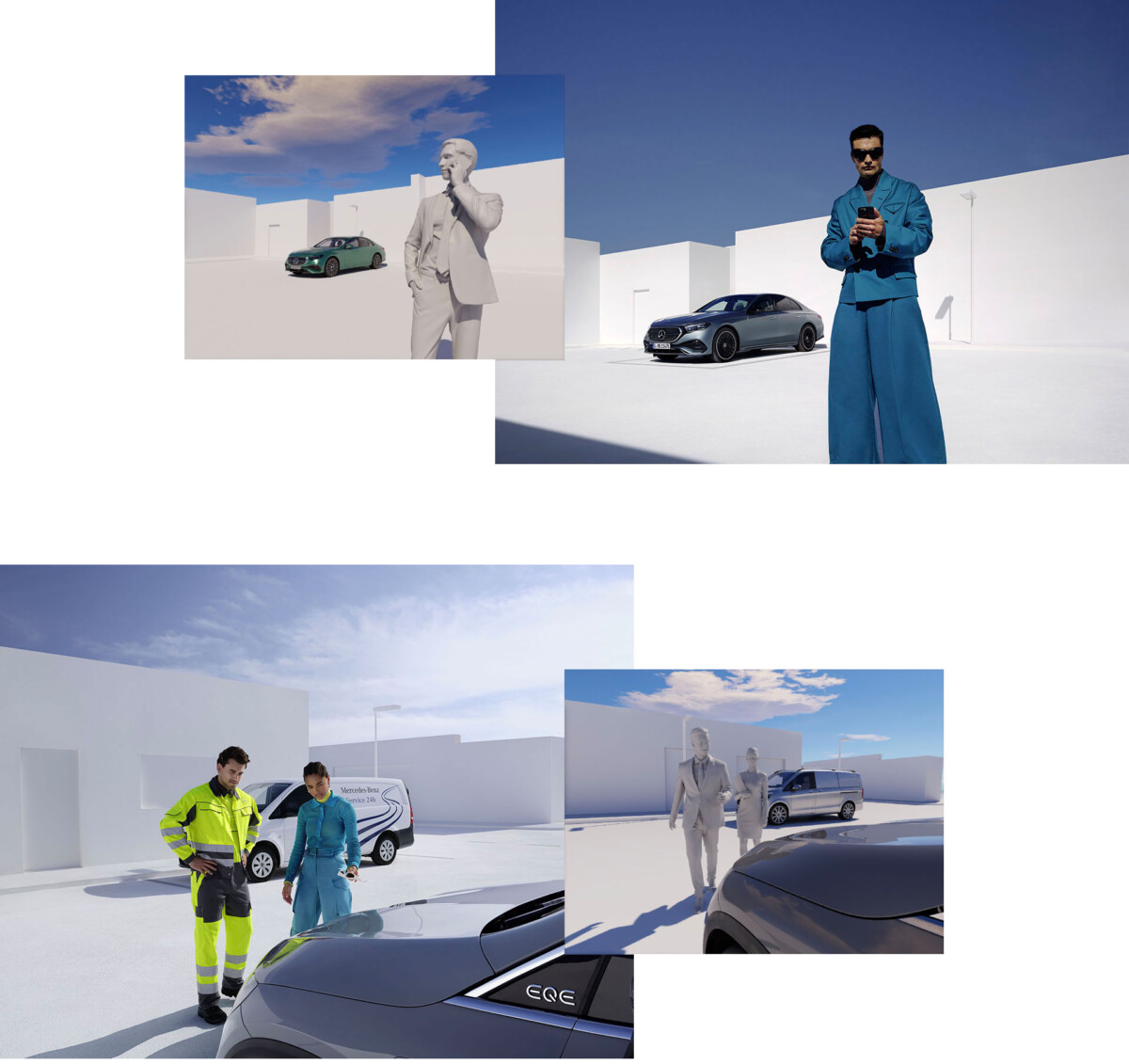 Time is money, a statement that holds particularly true for film and photo shoots. To ensure everything runs smoothly on set, we pre-visualized all photo motifs in a 3D real-time tool. We meticulously planned the positions of the vehicle and people, the focal length of the lens, and the exact position of the sun at the specific time of day in a 1:1 digital model of the set. This preparation enabled the photographer and his team to work as efficiently as possible on set.