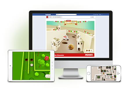After putting the layout together, adapting the game physiks for both developments (mobile and desktop) was quite a challenge. So the game was recreated in Maya to add some 3D magic. Unity was used to make the Kugeltour playable for Android and IOS. Afterwords everything was implemented with Flare 3D or Flash for PENNY fans playing on their desktops with the Facebook app.
