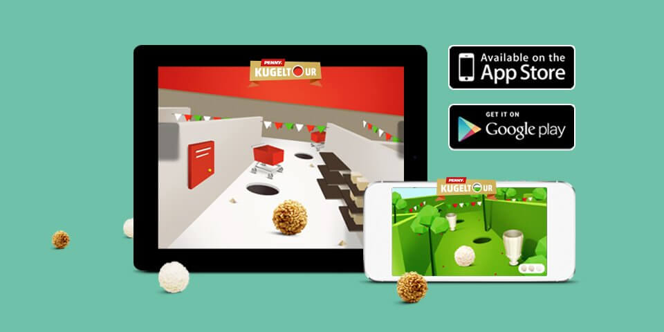 The PENNY Kugeltour looks like a typical labyrinth game, except that the player doesn’t use marbles to win, but delicious sweets. Balancing the chosen sweet by moving the mobile device or the arrow keys on a computer, the player has to go through three different levels. Starting in a PENNY supermarket, he moves to a garden in level two and can win the game in level three on an italian piazza. Every level has different barriers and traps, which become harder to overcome the closer the player gets to the end. There is no time limit, but if the player loses all three sweets, he has to do the level again.