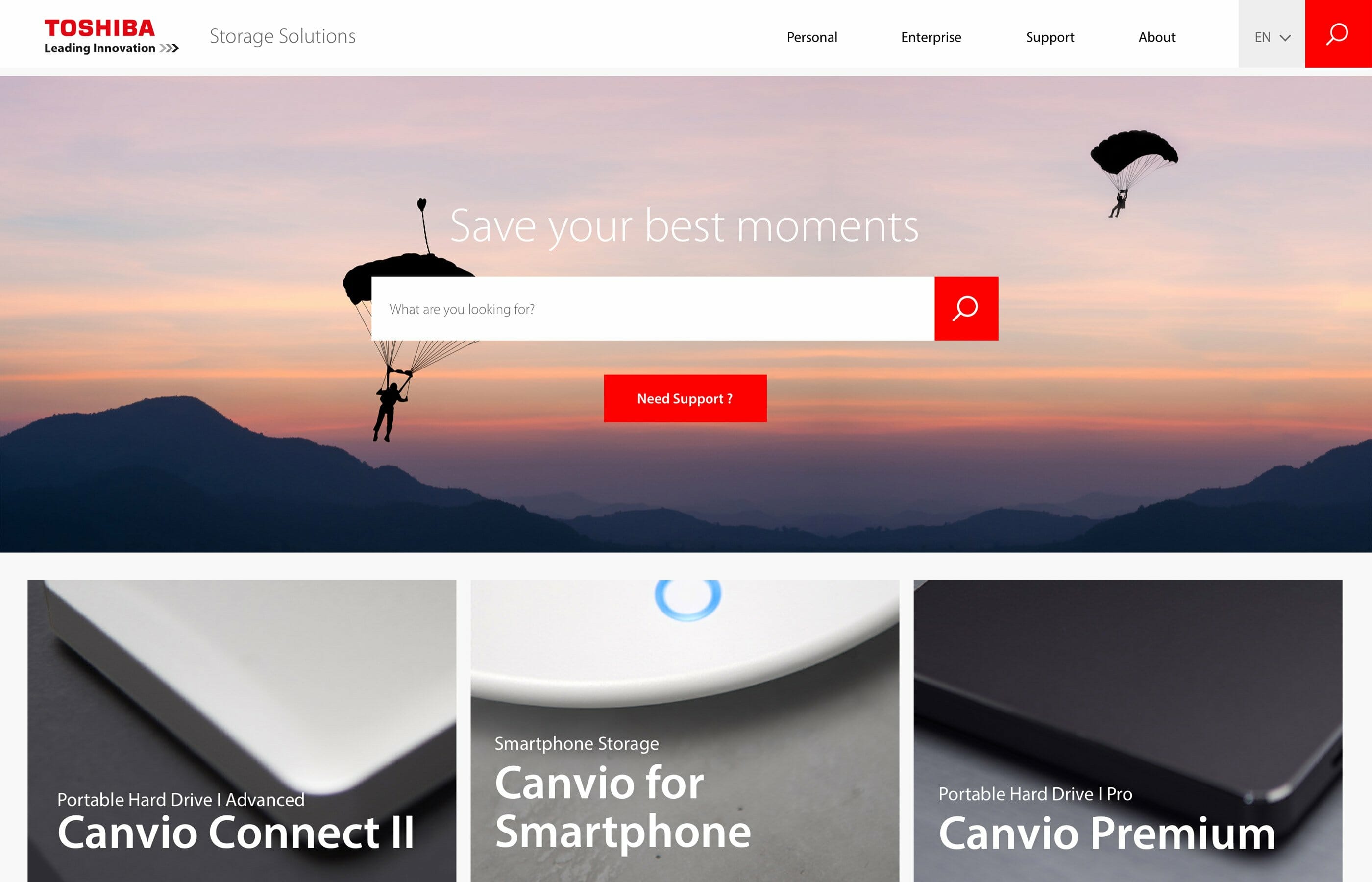 In 2017, we launched the new website for Toshiba Storage Solutions. The objective for the new website was amongst other things to optimise click-paths and improve usability. The challenge was to build a responsive brand experience that fits the users needs. The question we asked ourselves was “How do people look for products today?” The answer was simple: They SEARCH for it. By using search engines or directly searching on online trading websites. Search engines spit out information quickly, easily and directly. And that was exactly what led us to follow the example and define a goal for the concept: a smart and user-friendly content grid, combined with an intuitive search bar.